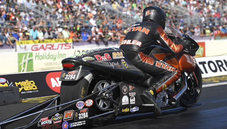 Ryan Oehler now claims 11 runs on his EBR-bodied Pro Stock Motorcycle and he feels he’s moving in the right direction. That’s both figurative and literal in the case of the Auto Club Road to the Future candidate. Oehler struggled with keeping the bike straight on his first handful of runs but feels he has that problem under control entering the NHRA Toyota Nationals.