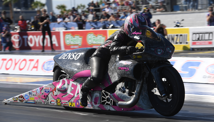Angie Smith did not perform well at the starting line in 2017. The veteran Pro Stock Motorcycle racer averaged a .062 reaction time, turned on the red light six times and beat herself up about performing well below her own standards. This year, Smith leads the two-wheel category in reaction time average (.022) and only has two red lights. That turnaround isn’t temporary.