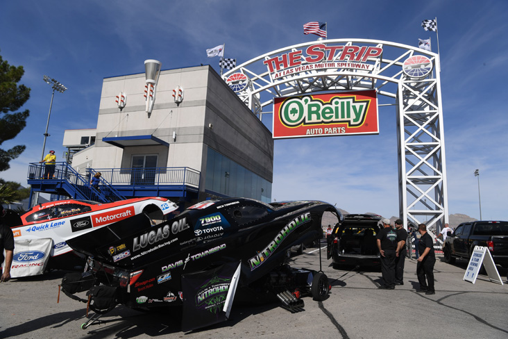 The Strip at Las Vegas Motor Speedway allows cars to make the entrance to the racetrack through this fabled arch before heading down the dragstrip.