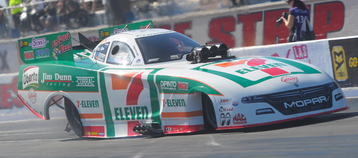 Jim Campbell and the Jim Dunn/7-Eleven team didn’t qualify for the Countdown this year and with only one round-win to their credit it’s probably unlikely they’ll win an event this year, but for Campbell, in his second year driving for the iconic Funny Car team owner, a three-second run would help salve a lot of disappointment and after a recent rash of 4.0s passes, it may come soon.