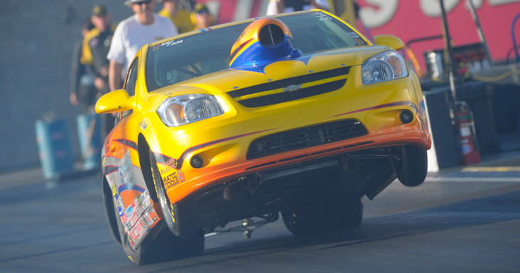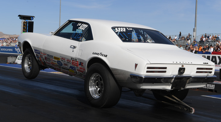 The Super Comp field in Las Vegas featured a number of drivers still in contention for the world championship but none of them made the final round. Wright, who claimed wins at the Pomona season opener in 2010 and 2012, added a third title after Ken Mostowich fouled by just four-thousandths of a second in the final round. Wright opened eliminations with a nearly perfect 9.051 on the 9.05 altitude-adjusted index and knocked off national event winners Robert Naber, Marko Perivolaris, and Mark Grame to reach the final. Mostowich, driving his ’68 Camaro against a huge field of dragsters, topped title contender Tom Stalba to earn a bye into the final. [Video]