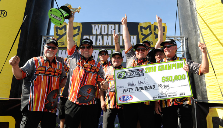 (Above) NHRA on FOX reporter Lewis Bloom was on hand to talk to Rickie Smith after he won his opening-round race in the E3 Spark Plugs Pro Modified class to set himself up for a possible championship if he could win his second-round race with Rick Hord. Smith lost in round two and the championship went to Mike Janis and his team (below). [Story]