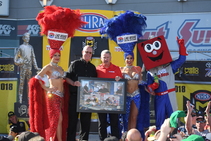 Chris Powell, second from right, President and General Manager at Las Vegas Motor Speedway, acknowledged the upcoming retirement of NHRA Senior Vice president Graham Light with a commemorative photo montage and an expenses-paid trip to Las Vegas for Light to see his favored Anaheim Ducks take on the Las Vegas Golden Knights the next time the two NHL Pacific Division rivals face off at T-Mobile Arena.
