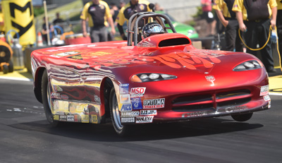 Versatile Phil Unruh won in Top Dragster presented by Racing RVs.com over Steve Will, the father of former Top Fuel racer, Hillary Will. Unruh won for the sixth time in his career when Will fouled by four-thousandths in the final. Unruh would have been tough to beat regardless with a .015 light in his Special Metals dragster. Unruh, who has won in Top Dragster, Super Stock, and Super Street, survived a tough battle against former national champ Matt Driskell and also logged wins against Mario Boesch and Rusty Baxter on his way to the final. Unruh also competed in the Top Sportsman class in Topeka with his turbocharged Corvette, but lost in round two after a -.003 red-light start. Will, who was a runner-up earlier this season in Phoenix, was nearly perfect with a .001 light in his semifinal win against Phil Dion.