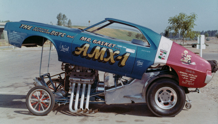 Here’s a car that put the “funny” in Funny Car back in those early days, the Genuine Suspension AMX-1 Javelin from 1969. As Funny Cars began to gain popularity the team simply took its Super Rat Fiat Topolino Fuel Altered chassis and plopped a shortened AMX body on it. Experienced Fuel Altered handler Tom Ferraro drove the wild machine to 7.30s at more than 190 mph and was behind the wheel when the car burned to the ground; he suffered some serious burns that kept him in the sidelines for a few years.