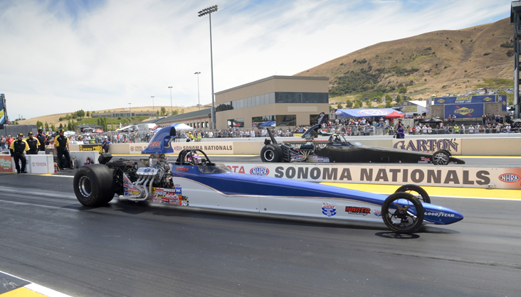 Super Comp champ Naber has five wins, and three of them have come at Sonoma Raceway. Naber, a former professional motocross rider, picked up his latest Wally after a narrow 8.911 to 8.920 victory against Matt Woodard. Naber began eliminations with an impressive run that included a .002 light and an 8.904 against Thomas Bayer. He later scored wins against Val Torres, Trey Vetter, and Eric Reyes. Naber defeated Reyes with a perfect .000 light and an 8.932. Woodard was the low qualifier thanks to an 8.901 pass and went on to score a huge semifinal win over seven-time world champ Peter Biondo. [Video]