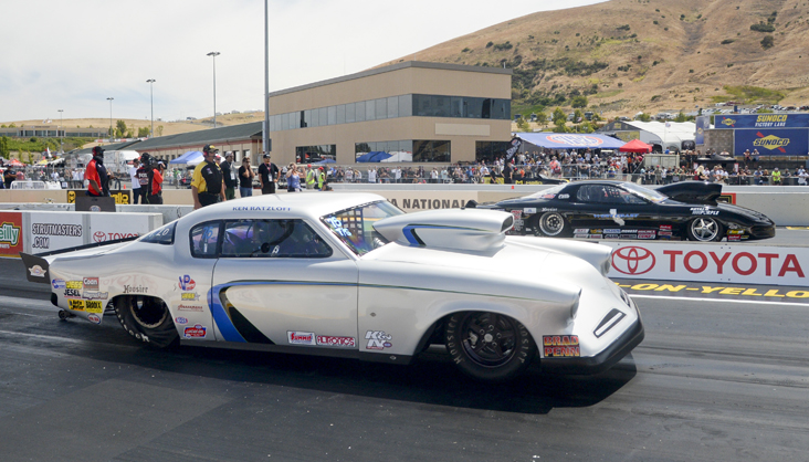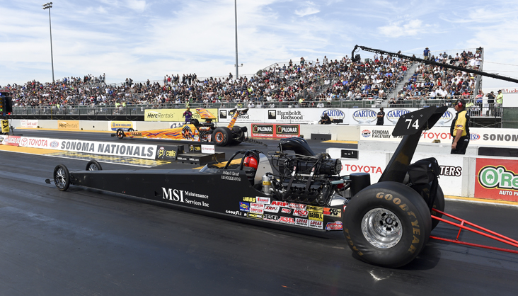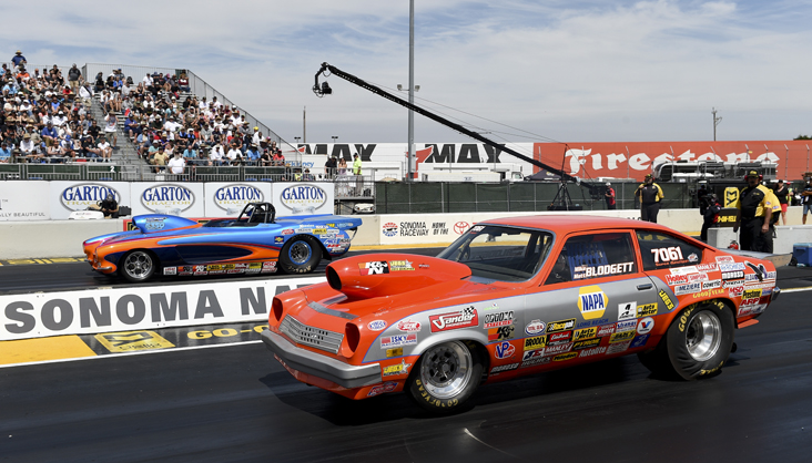 Blodgett became the third member of the Blodgett family to score a win in Sonoma when he drove his family’s ’72 Vega to a final-round victory in Super Gas against Ron MacKenzie, who fouled by .12-thousandths. Blodgett, whose only other national event win came at the 2008 JEGS Pacific SPORTSnationals in Fontana, Calif., cut a perfect .000 light on his quarterfinal bye run and then took out former world champ Rick Beckstrom in the semi’s with another great run that included a .010 light and an index-matching 9.902. Blodgett broke out by eight-thousandths. Super Comp winner Naber also had a solid outing in Super Gas, reaching the quarterfinal round. [Video]