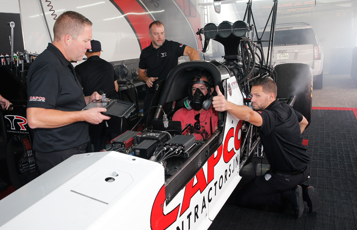 Crewmember Gary Pritchett gives driver Steve Torrence the thumbs up as they warm up the points-leading Capco dragster.