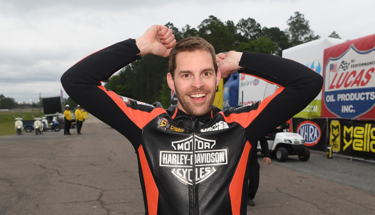 Andrew Hines breathed a huge sigh of relief after scoring his first Pro Stock Motorcycle win in more than a year. Hines also set the elapsed time record at 6.720-seconds, and set a personal best 199.94 mph.
