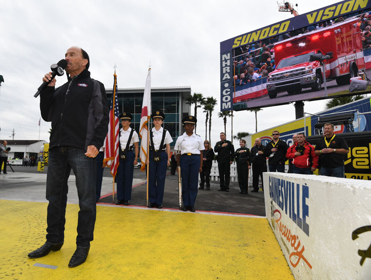 Award winning country music artist Lee Greenwood made an appearance in Gainesville to sing his signature tune, "God Bless the U.S.A.", as part of NHRA’s regular pre-race tribute to first responders.