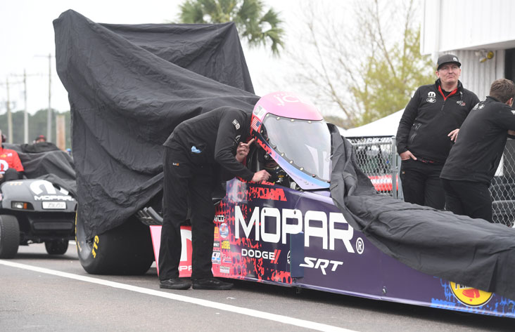 The first round of Top Fuel was nearly completed before a brief rain shower held up the proceedings. While the Safety Safari dried the track, race teams, including Leah Pritchett’s Pennzoil crew, did what they could in order to stay dry.