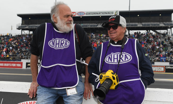 It isn’t an exaggeration to suggest that veteran photographers Steve Reyes, left, and Rich Shute, have captured more long-lasting drag racing images than anyone else. Reyes announced the 50th Gatornationals would be his last event and fittingly, he was honored during pre-race ceremonies.