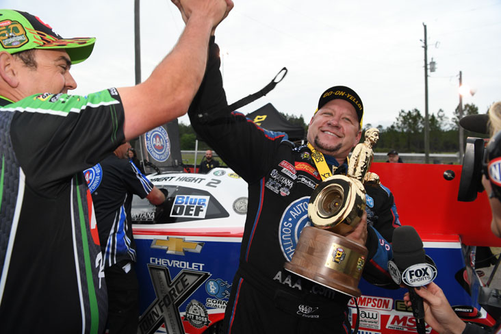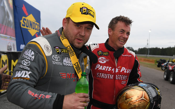 After successfully defending his 2018 Gainesville Top Fuel win, Richie Crampton was congratulated by runner-up Clay Millican. Crampton is now a nine-time winner in the Top Fuel class.