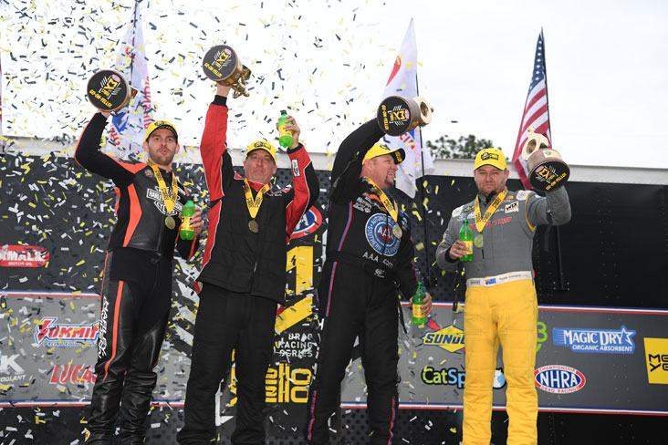 Each of the four Mello Yello pro champs celebrated with the special edition gold NHRA Wally trophies that went to all the champions of the 50th annual Amalie Motor Oil NHRA Gatornationals.