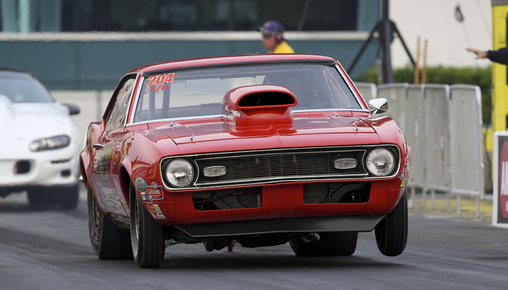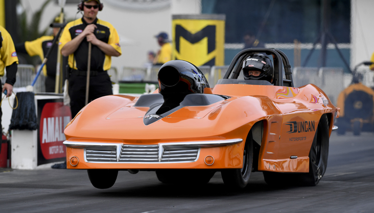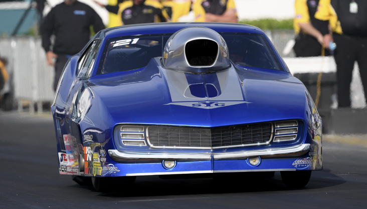 Bourgeois wheeled his front-engine Nostalgia Dragster to his ninth career win, all of them in Comp. The 2015 national champ cut a perfect .000 light in the final against opponent Randy Daniels and needed almost all of it. Daniels drove his G/Altered Pontiac to a (-.603) 8.297, but it wasn’t enough to beat Bourgeois’ (-.560) 6.820. Bourgeois’ biggest round-win came in the quarterfinals, where he defeated 100-time national event winner David Rampy to earn a bye into his 12th final. [Video]