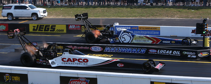 Steve Torrence also won his second-straight race in his Capco Contractors Top Fuel dragster. Torrence narrowly edged three-time champion Antron Brown in the final with a 3.881-second pass, took down his dad, Billy Torrence, in the semifinals and beat teammate Scott Palmer in the second round. It's Torrence's 30th Top Fuel victory; his first came at Virginia Motorsports Park.