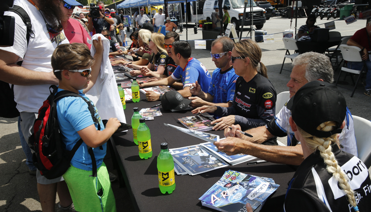 All the Pro Stock Motorcycle stars lined up for an autograph session at the Arby's NHRA Southern Nationals.