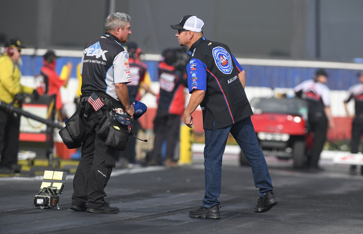 Funny Car points leader Robert Hight, right, didn't make it down the track in Q1, but not for lack of trying as he and John Force racing track specialist Lanny Miglizzi consulted before the run.