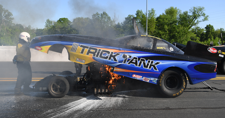 North Carolina racer Bob Gilbertson backfired the blower and knocked loose the hood-mounted burst panel on his first shot of the day, His second ended a little worse with a top-end fire after a successful qualifying pass.