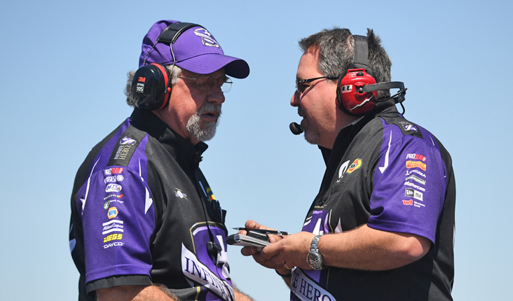 John Medlen, left, and Dean Antonelli, crew chiefs for Jack Beckman's Infinite Hero Dodge, consulted prior to their first run of the day. Beckman finished as the No. 2 qualifier.