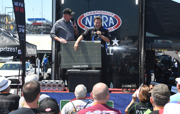 Funny Car ace Del Worsham joined NHRA announcer Alan Reinhart to teach some fuel-racing basics to the fans in the pits in the popular Nitro School segment.