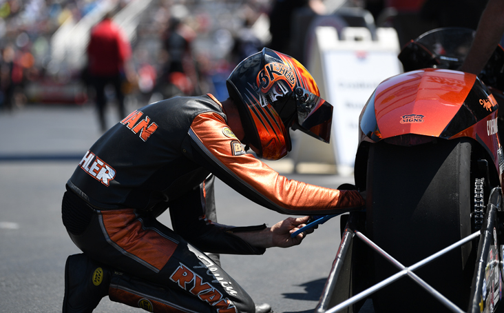Fast-rising Pro Stock Motorcycle rider "Flyin' Ryan" Oehler made a last-minute tire-pressure adjustment on his EBR-bodied V-twin bike.