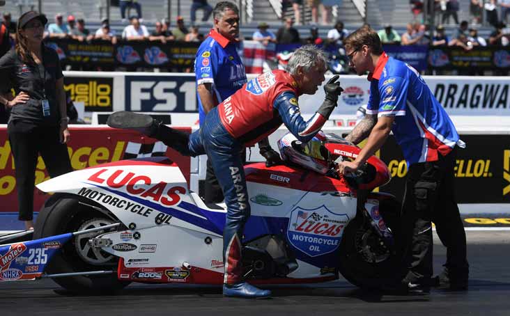 A very animated Hector Arana Sr. climbed off of his Lucas Oil EBR after a starting-line malfunction in the semifinals. The race ultimately was rerun, but Arana did not advance.