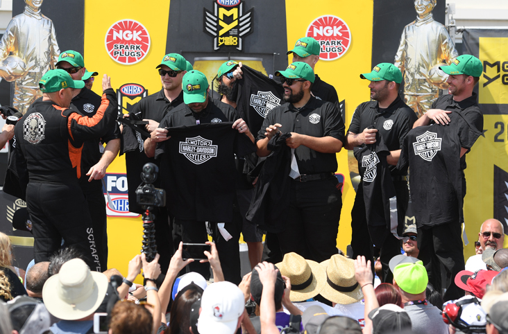 Low qualifier Mike Salinas decided to reward his crew after his breakthrough Top Fuel win in Las Vegas. He brought them all on stage and handed them folded t-shirts, telling them that if their shirt had a Harley-Davidson logo on it, they would win a new motorcycle. Much to their surprise, all of the shirts had the logo.