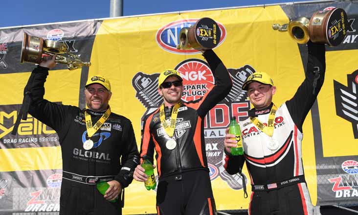Your event champions, from left, Shawn Langdon, Andrew Hines, and Steve Torrence celebrated together in the zMAX Dragway winner's circle.