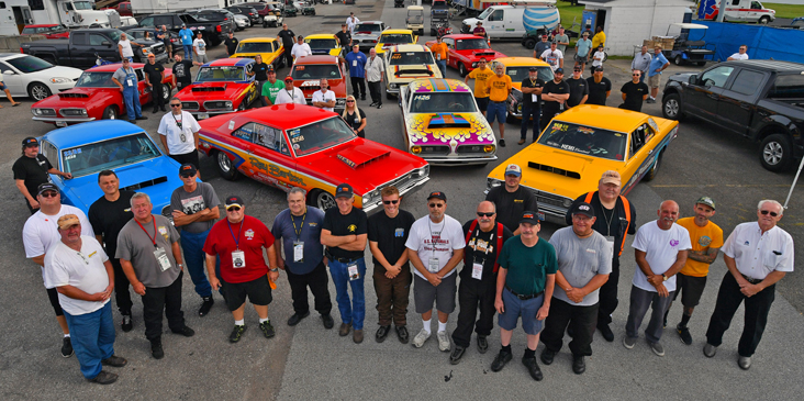 The contestants, cars, and crews in the Dodge Hemi Challenge assembled for a class photo prior to the start of competition this morning.