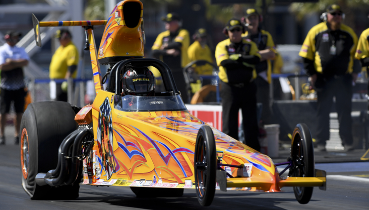 Four years after winning his first national event title in Las Vegas, Spiegel struck again in Top Dragster presented by Racing RVs. Spiegel, who built his own engine and the engine for Top Sportsman champ Crumlich, defeated Robert Tehle in the final with a 6.736 on his 6.71 dial. Spiegel defeated Ed Olpin in the quarterfinals and followed with a semifinal victory against Super Stock winner Bertozzi. [video]