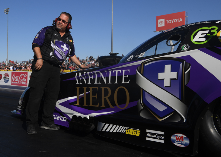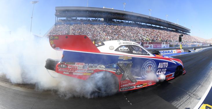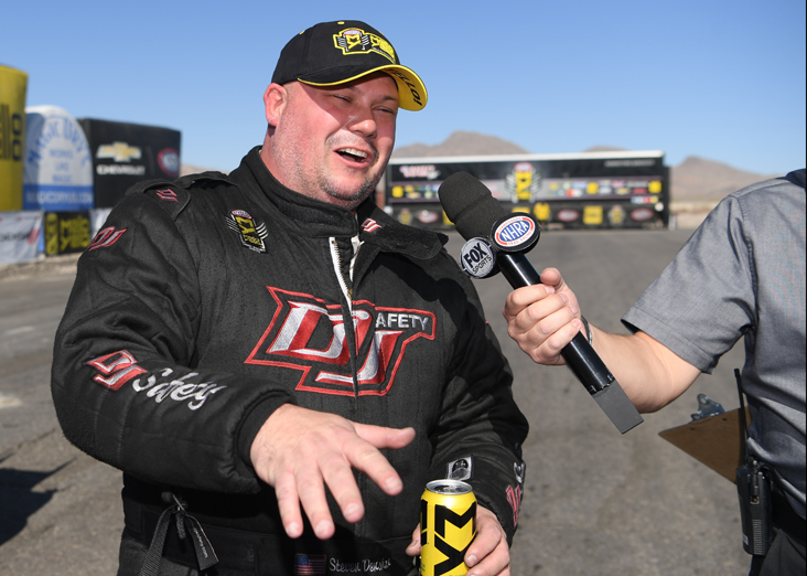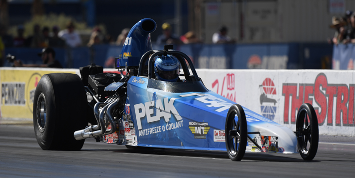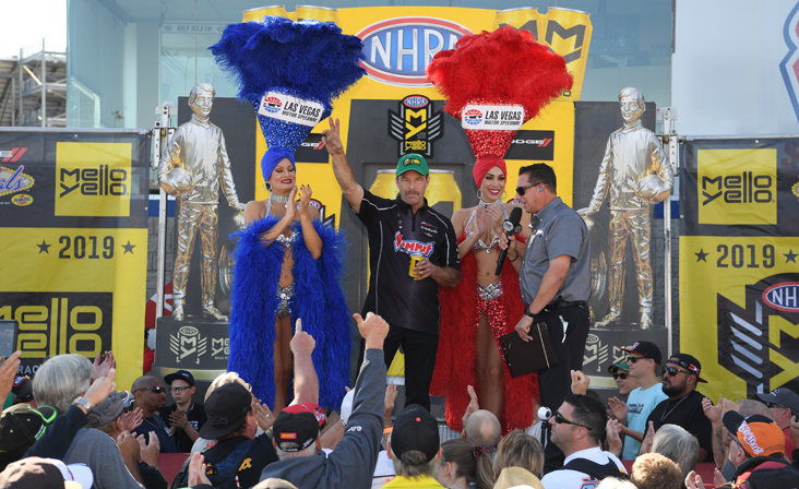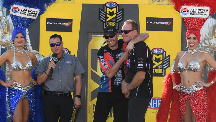 J.R. Todd, right, who had won the last three events at The Strip at Las Vegas Motor Speedway, congratulated Jonnie Lindberg for taking him out in round one of Funny Car. Lindberg would go on to reach the final, the fourth of his career in the class.