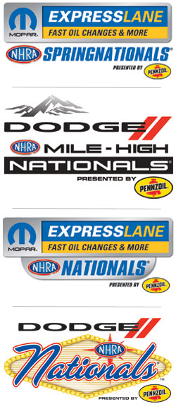 The brands will mark their first new title sponsorship with the Mopar Express Lane NHRA SpringNationals presented by Pennzoil, set for April 12-14 in Baytown, Texas, near Houston. In the fall, the newly christened Dodge NHRA Nationals presented by Pennzoil will hit The Strip at Las Vegas Motor Speedway on Oct.31–Nov. 3.