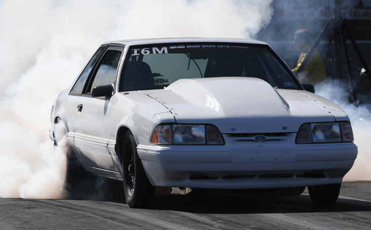 Drag Week champ Randall Reid and his ’93 Mustang, powered by a 427-cid Chevy LS engine with a single 88mm turbocharger, was the early leader with a near-perfect 8.517 on its first pass and ran 8.529 onhis fourth passes, but in between he ran under the 8.50 target, killing his average with the penalty e.t.
