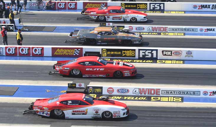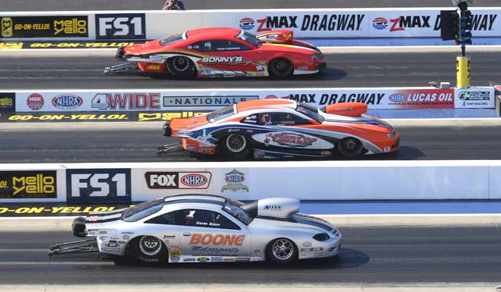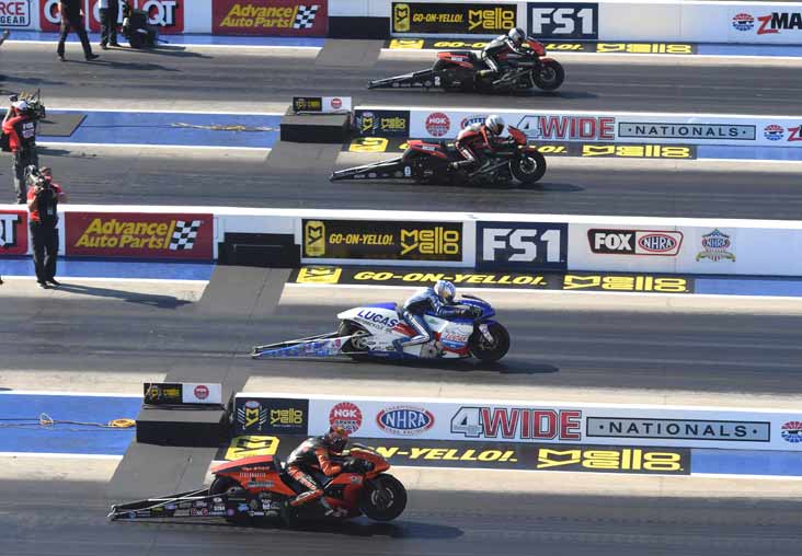Pro Stock Motorcycle round one: Eddie Krawiec, a five-time runner-up at the zMax Four-Wide event, took a step towards his first win when he won his quad over Ryan Oehler, Joey Gladstone, and Steve Johnson. Oehler, looking for his first win anywhere, also advanced from the No. 13 qualifying position. Both riders ran 6.88 elapsed times.