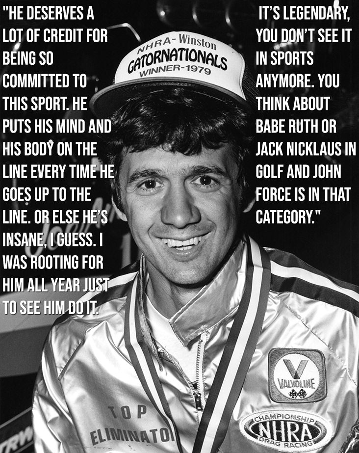 "He deserves a lot of credit for being so committed to this sport. He puts his mind and his body on the line every time he goes up to the line. Or else he’s insane, I guess. I was rooting for him all year just to see him do it. It’s legendary, you don’t see it in sports anymore. You think about Babe Ruth or Jack Nicklaus in golf and John Force is in that category."