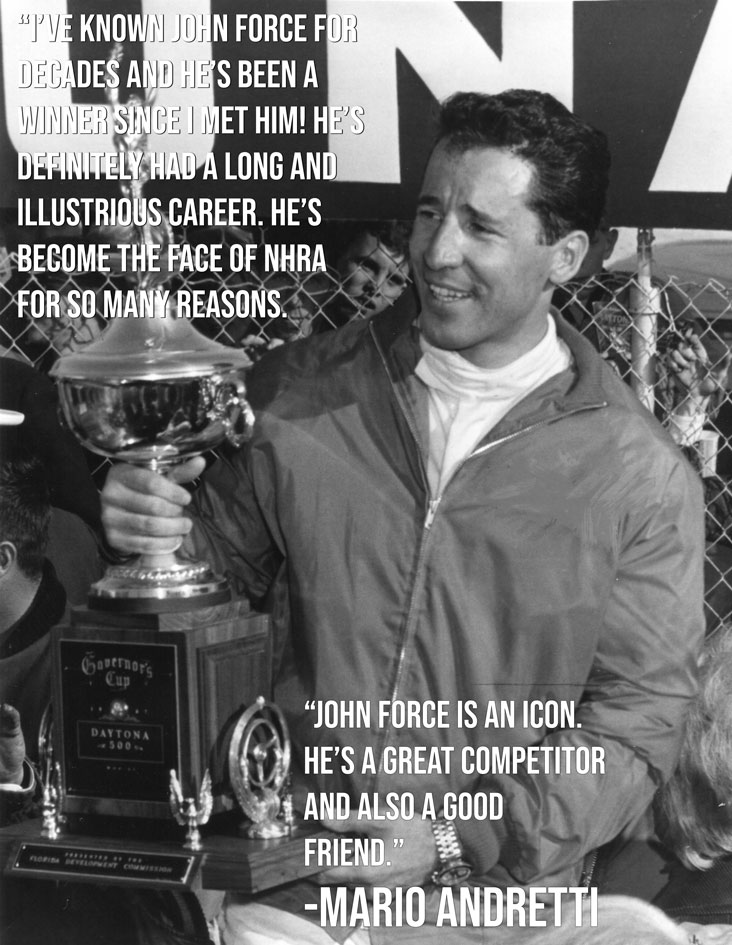 “I’ve known John Force for decades and he's been a winner since I met him! He’s definitely had a long and illustrious career. He’s become the face of NHRA for so many reasons: He’s in the very elite, top superstar category of his game. But it’s also his demeanor and genuine kindness and the smile on his face that makes it impossible not to like him. That’s why he’s one of the best ambassadors of the sport. John Force is an icon. He’s a great competitor and also a good friend.”