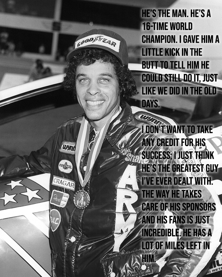 "He’s the man. He’s a 16-time world champion. I gave him a little kick in the butt to tell him he could still do it, just like we did in the old days. I don’t want to take any credit for his success; I just think he’s the greatest guy I’ve ever dealt with. The way he takes care of his sponsors and his fans is just incredible. He has a lot of miles left in him."