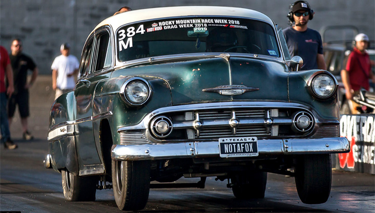 The field of Drag Week entries is diverse and nowhere is that more evident than Brown’s Texas-based ’53 Chevy Bel Air. Brown found the car eight years ago in pieces in a storage facility in Austin, Texas and has built it into an eight-second street machine with the addition of a six-liter Chevy LS engine and a single Borg Warner 76mm turbocharger. Brown has competed in the five drag week events and has been among the top eight finishers in 2018-19. His best performance is an 8.65 at over 157-mph.
