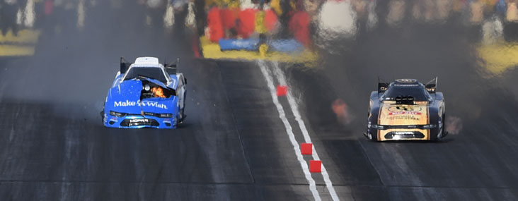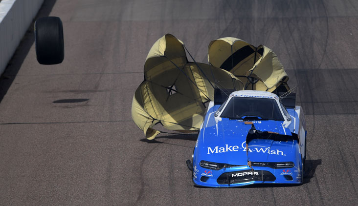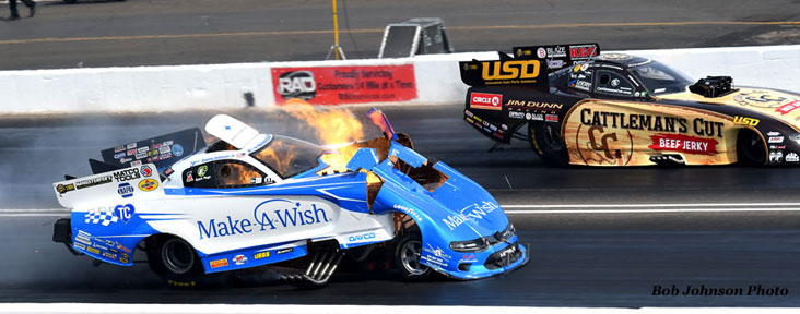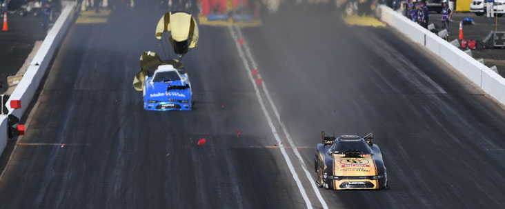 Tommy Johnson Jr., celebrating 30 years of nitro competition at this event, scored what is probably his wildest victory in round one of the Magic Dry Organic Absorbent NHRA Arizona Nationals, winning the round despite a car-damaging explosion.