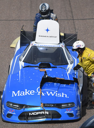 Racing Jim Campbell, Johnson’s Make-A-Wish entry broke the left-rear axle a few hundred feet into the run, which allowed the engine to freewheel and exploded the blower. The team’s new Dodge SRT Hellcat Charger body was badly damaged and the left rear tire and wheel broke loose.