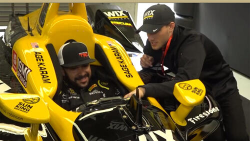 J.R. Todd tries out the cockpit of Wix Filters teammate Sage Karam's IndyCar ride