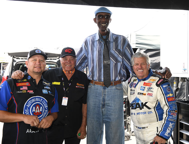 Seven-foot-8 George Bell, Guinness Book of Records holder as America’s tallest man, found himself in some tall company with three of NHRA’s best Funny Car racers, Robert Hight, Don Prudhomme, and John Force The Las Vegas resident is attending his first NHRA event.
