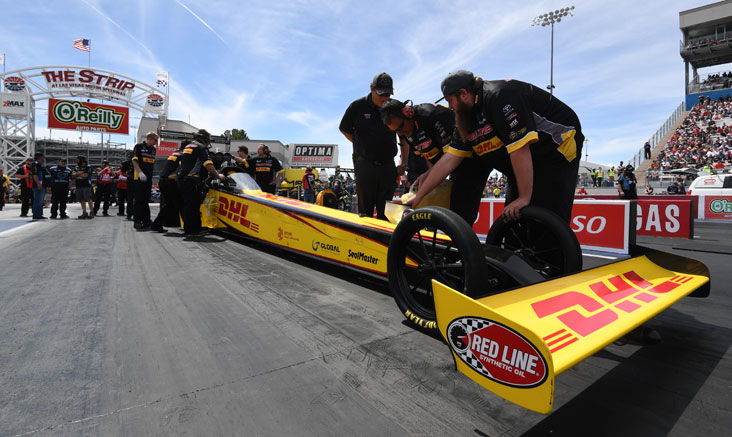 The DHL “Yella Fellas” of Richie Crampton’s crew had to do some impromptu refueling after Crampton and his qualifying mates had to be shut off on the starting line after Brittany Force had problems after her burnout.