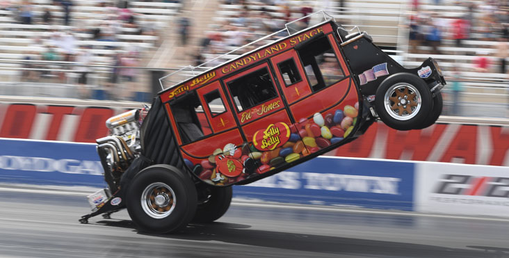 Veteran wheelstander driver Ed "the Outlaw" Jones put on a show for the fans with the Jelly Belly Candyland Stage.