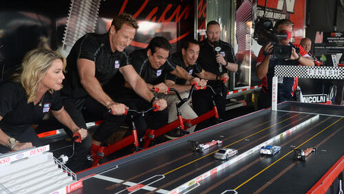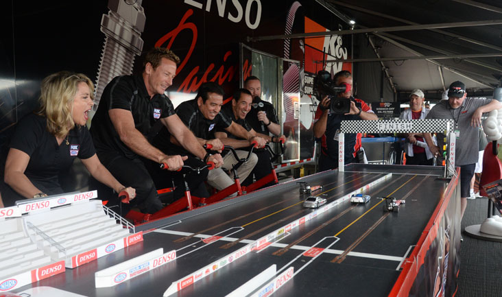 The NHRA on FOX team – from left, Amanda Busick, Bruno Massel Jr., Tony Pedregon, and Lewis Bloom -- went four-wide at the Denso display competing with bicycle-powered slot cars.