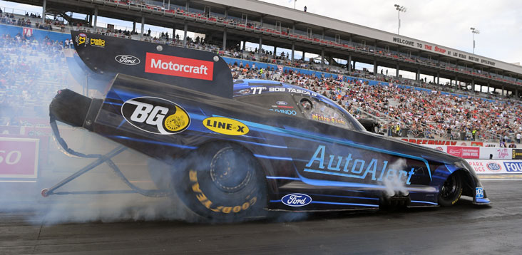 Bob Tasca III’s Motorcraft Mustang is sporting backing this weekend from Auto Alert. Tasca ended No. 7 in the Funny Car field after a 3.928 best.