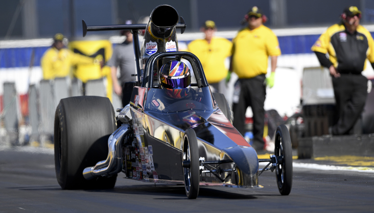 Taylor made the long trip from Pennsylvania to Pomona pay off with a victory in Top Dragster presented by Racing RVs. Taylor was outstanding during the five-round battle with no reaction time worse than a .015, including a .007 in the final that he used to get the better of Zach Sackman. Taylor won the bout with a 7.105 on his 7.05 dial while Sackman, wheeling one of the quicker cars in the field, was just two-thousandths of a second behind at the finish. Sackman’s brother, Matt, reached the final round in Top Alcohol Dragster. [Video]