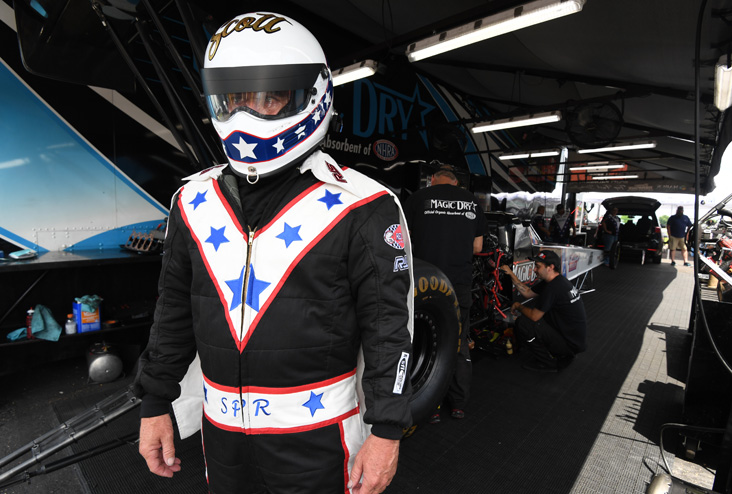 Top Fuel racer Scott Palmer is promoting the Topeka-based Evel Knievel Museum during this weekend's event. Palmer, and Top Fuel Harley racer Ricky House have special edition Evel Knievel paint schemes on their respective rides and also have special driving suits honoring the legendary daredevil.