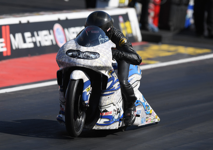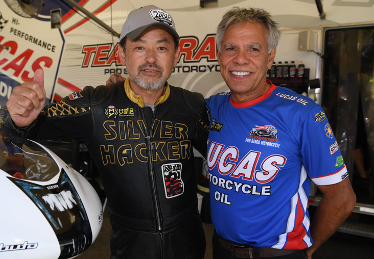 Making his first appearance at an NHRA event since 1996, Japanese racer Eiji Kawakami leased a bike from Hector Arana and the Lucas Oil team for the Denver event. Kawakami is one of many International riders who have raced in the Pro Stock Motorcycle class.